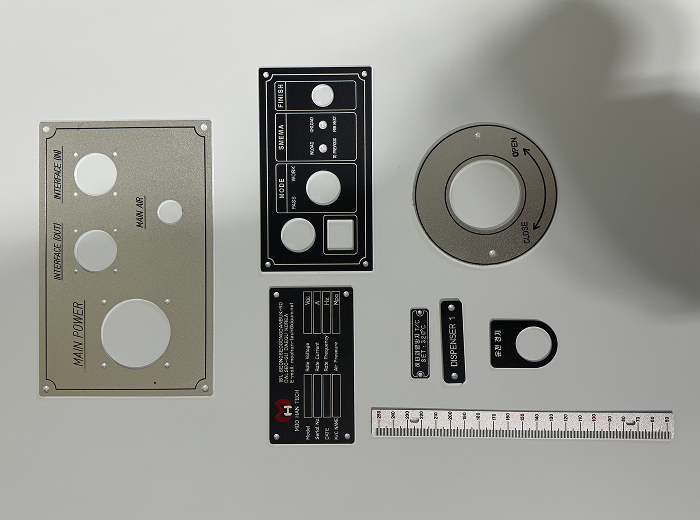 내구성이 요구되는 명판, 기계 패널, 제어용 표식 등에 주로 사용됩니다.